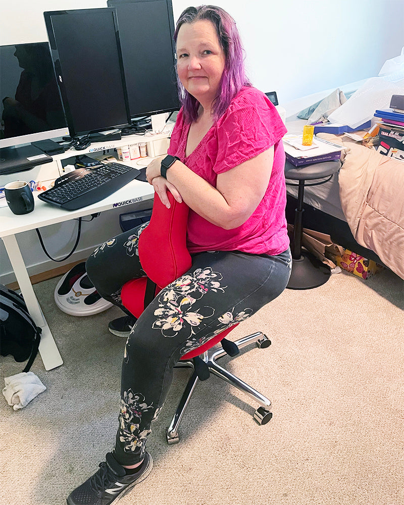 I've been using this wonderful chair - the NuChair. It's absolutely a new concept of how to sit and do your deskwork while maintaining proper alignment of your lower back. NuChair helps you keep your natural postural alignment with your knees, feet, ankles, and hips at 90 degrees. If you use NuChair in your daily sitting routine, you will have a good life with less pain!